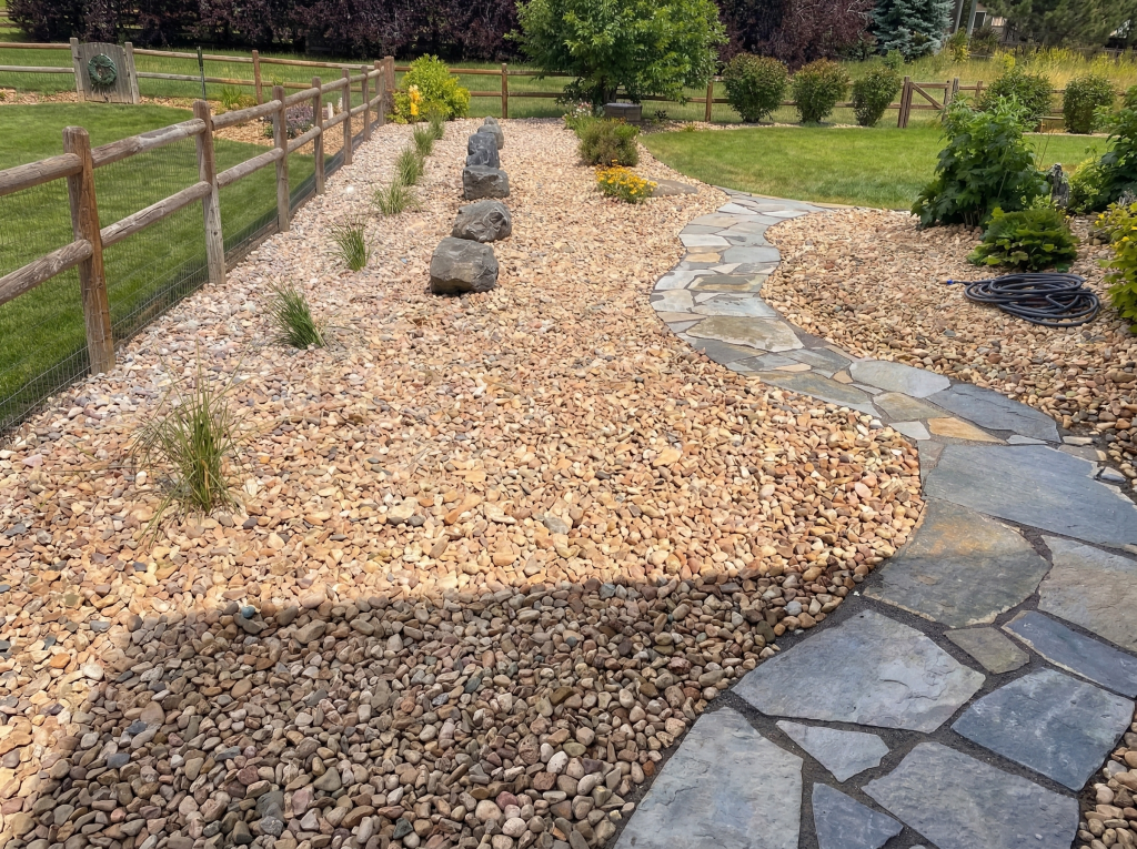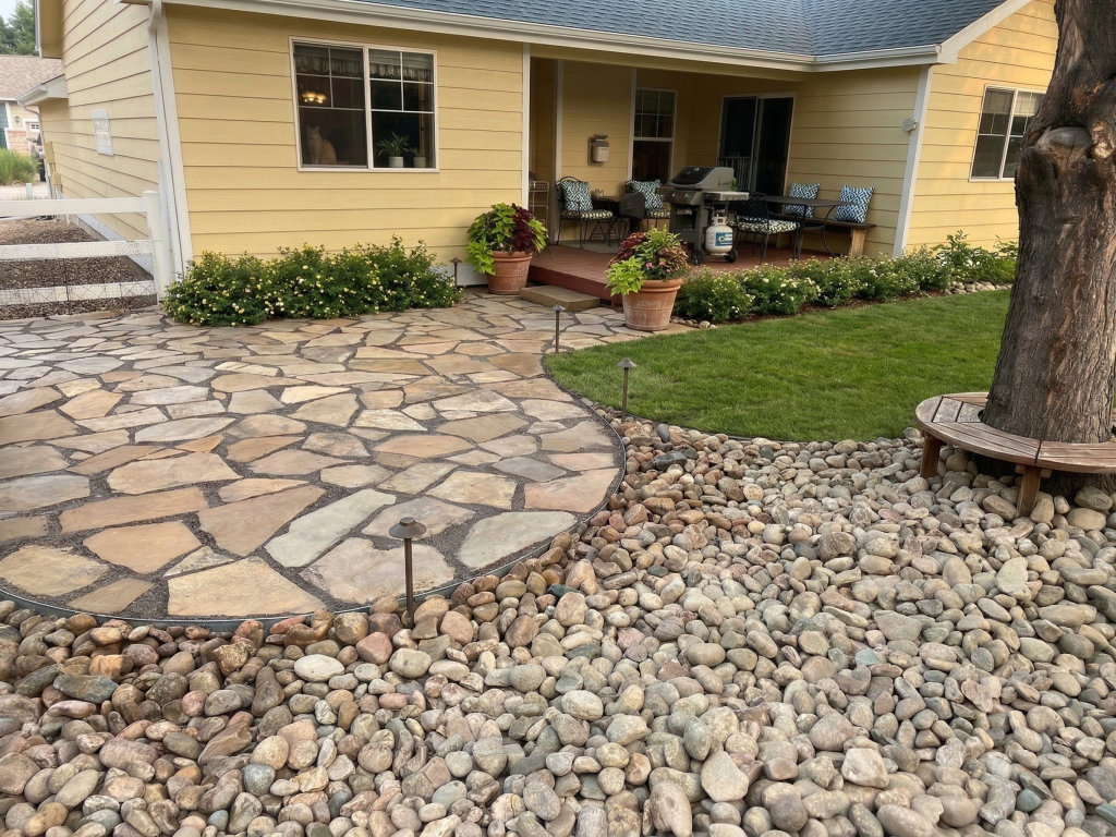 Pavers, flagstone, rock features, grading, planting, and outdoor layout design.